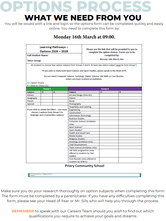 Year 9 Options Evening will take place on Thursday 26th February 2026 in the Main Hall.